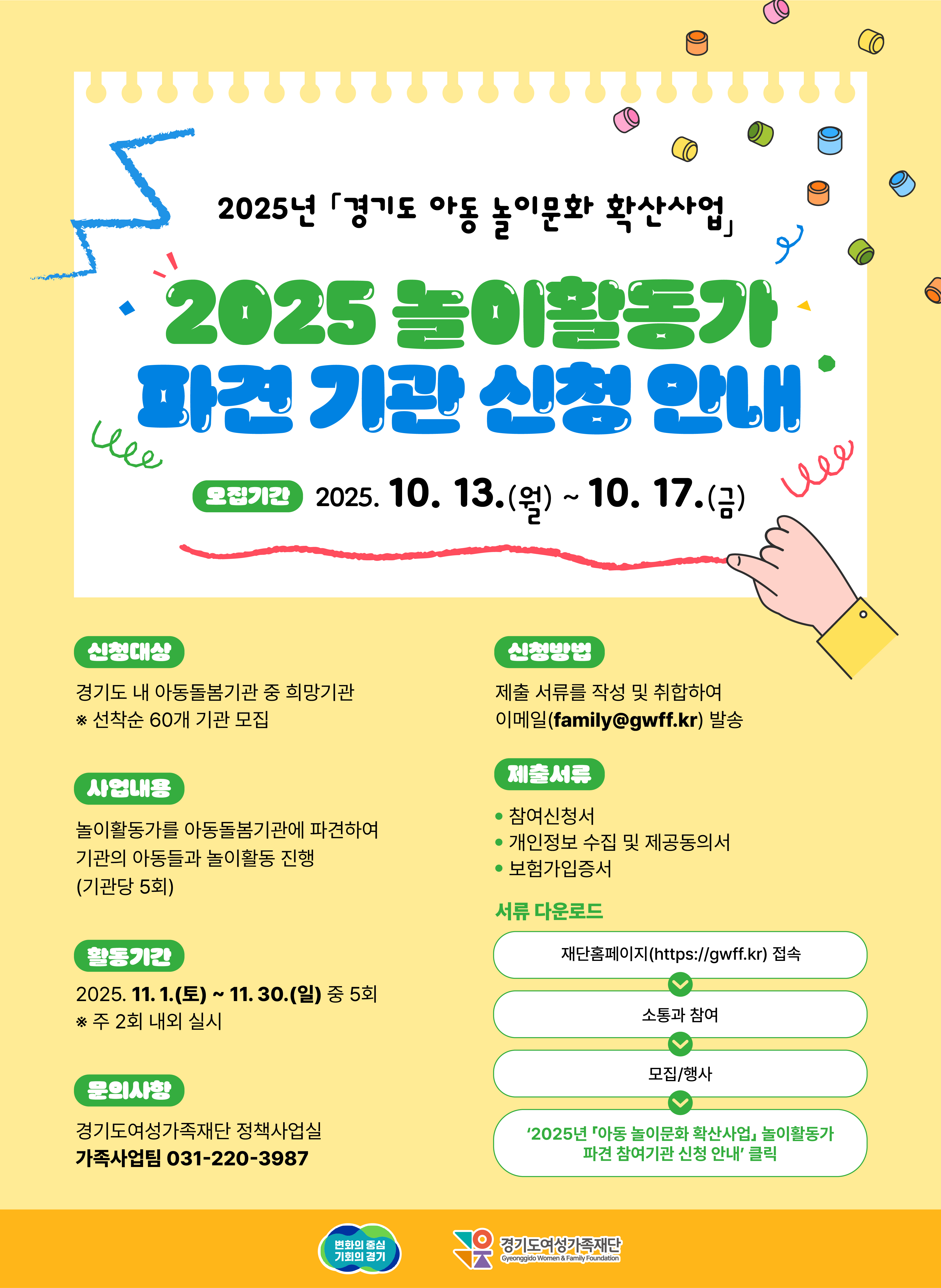 2025년 '놀이활동가' 파견 참여기관 신청 안내(~ 10/17)