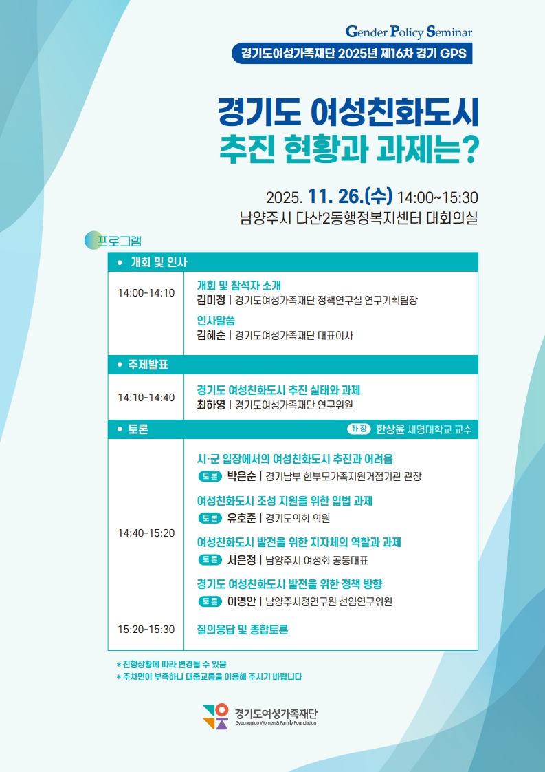 2025년 제16차 경기GPS「경기도 여성친화도시 추진 현황과 과제는?」안내