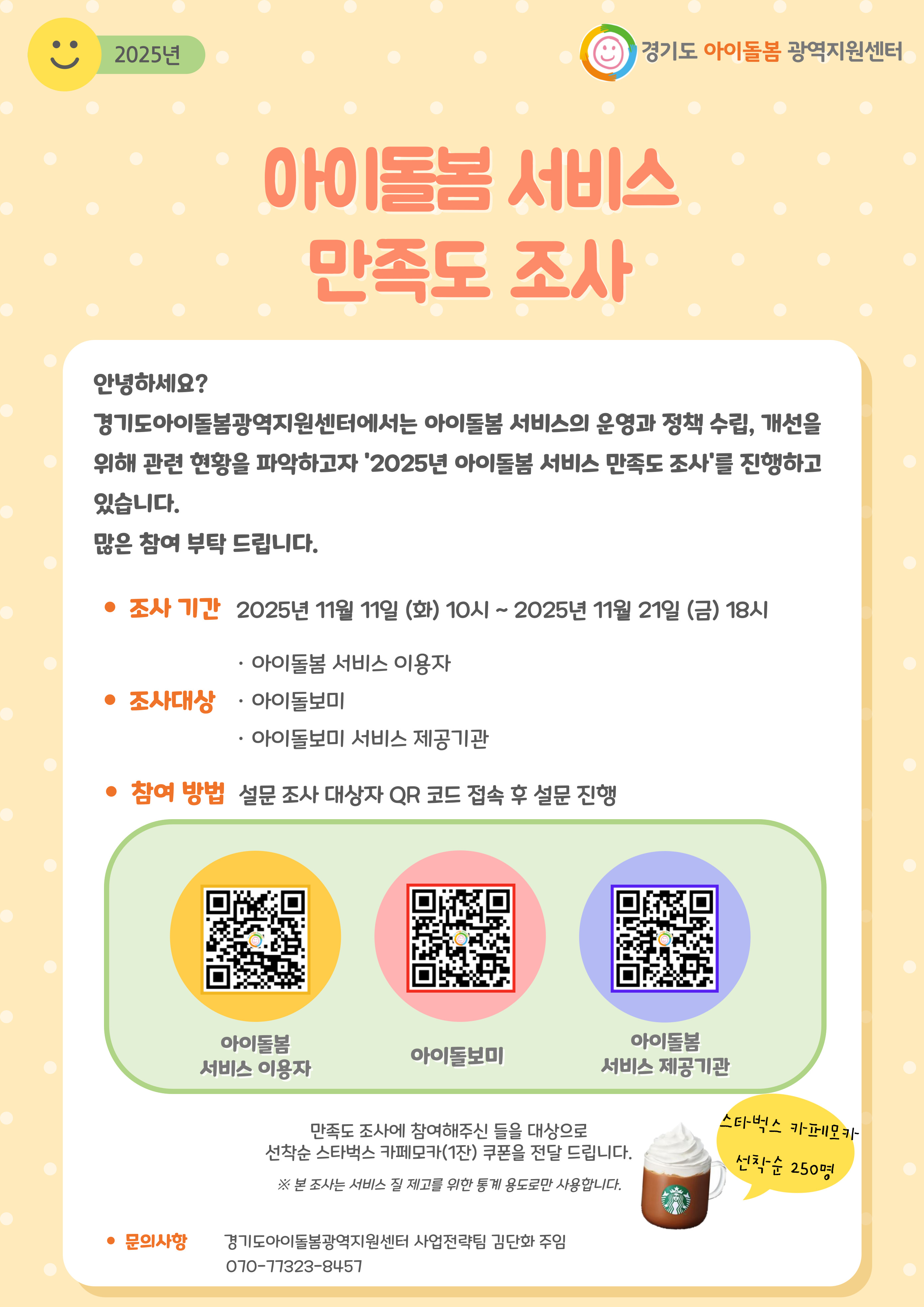 경기도아이돌봄광역지원센터에서 「2025년 아이돌봄 서비스 만족도 조사」를 실시합니다.