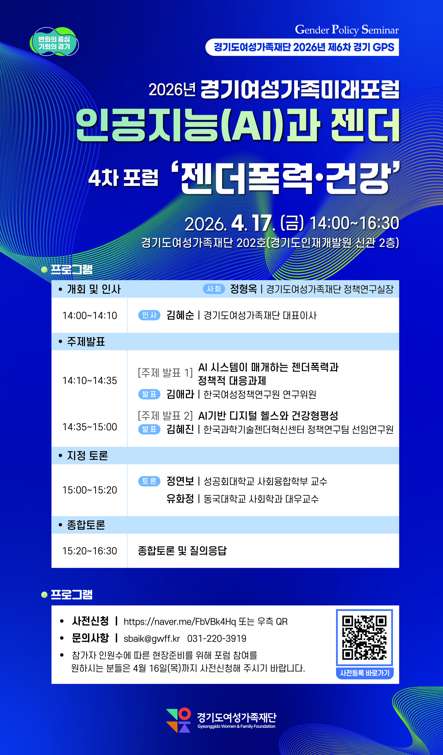 경기여성가족미래포럼 4차 포럼이 4월 17일 개최됩니다.