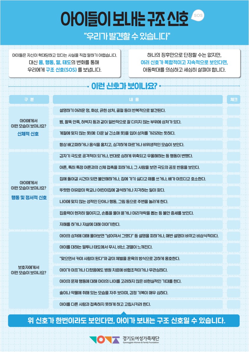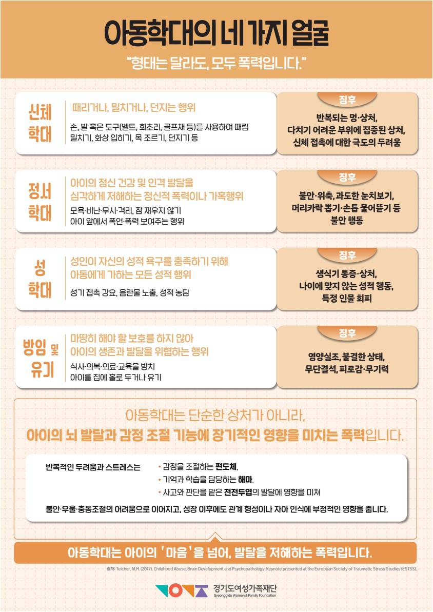 경기도여성가족재단은 도민 누구나 아동학대를 올바르게 이해하고 즉각 대응할 수 있도록 메인 포스터와 함께 총 4종의 세부 안내 포스터를 제작하였습니다.