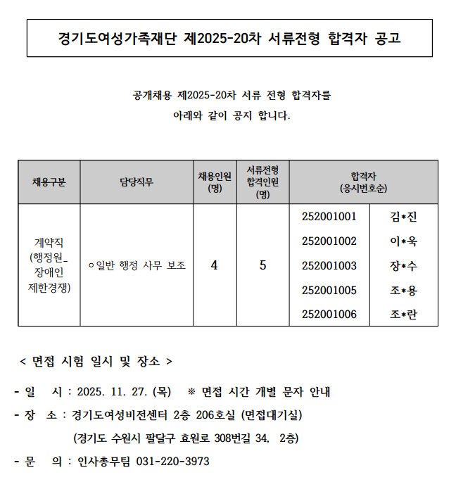 [채용공고 제2025-20차] 서류 전형 합격자 공고 (장애인 제한경쟁)