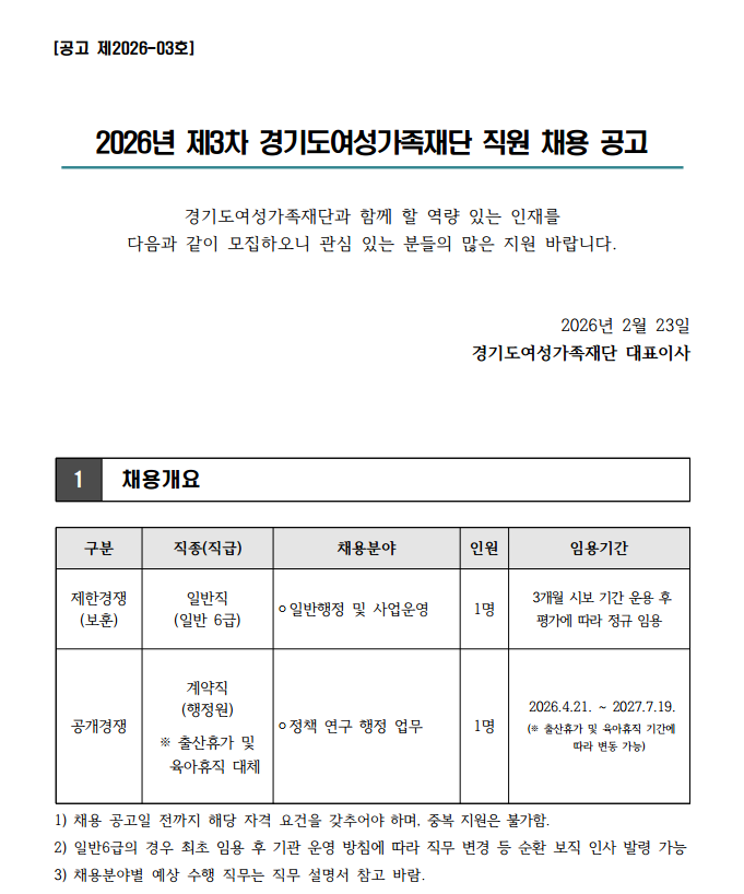 [채용공고 제2026-3차] 경기도여성가족재단 직원 채용 공고