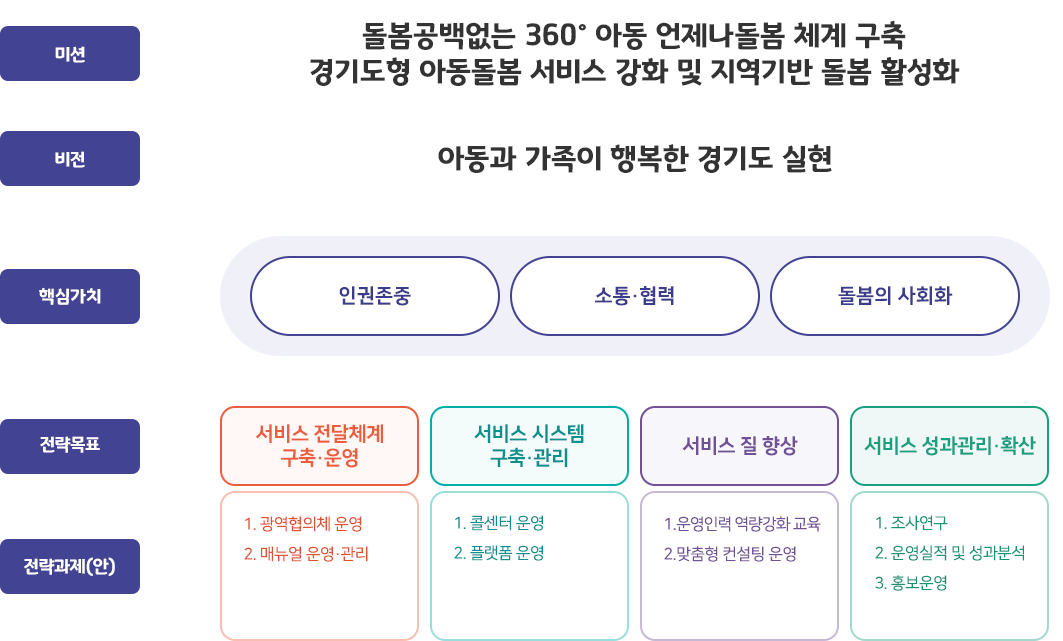 삶의 질 향상 : 경기도형 ‘틈새 없는 공공 아동 돌봄 서비스’ 제공을 통한 도민 삶의 질 향상 돌봄 생태계 조성 : 안전하고 촘촘한 민·관 거버넌스 운영을 통한 지역 기반 돌봄 생태계 조성