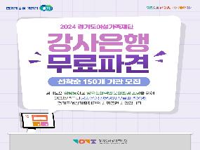 변화의 중심 기회의 경기-평등으로 한걸은, 더따뜻한 경기 2024 경기도여성가족재단 / 강사은행 무료파견 / 선착순 150개 기관 모집 경기도의 성평등하고 양육친화적인 문화환경 조성을 위해 2005년부터 강사은행 전문강사 무료파견 운영! 경기도여성가족재단의 사회공헌 사업입니다. 경기도여성가족재단 변화의 중심 기회의 경기-평등으로 한걸은, 더따뜻한 경기 강사은행 무료파견이란? 교육이 필요한 곳에 전문강사 무료연계 교육의 필요성을 체감하지만 강사섭외가 어려운 기관! 강사료가 부담되는 소규모 사업장이나 복지시설! 지원대상:경기도내 / -종업원 50인 미만 사업장 / -소규모 복지시설, 기관, 단체 등(지역아동센터,청소년쉼터, 한부모보호시설, 공동생활가정, 민간어린이집, 작은도서관 등) 교육내용 / -4대폭력 예방교육(성폭력,성희롱,성매매,가정폭력), 양성평등교육 / -대상별 맞춤형 부모교육(영유아,아동,청소년 자녀를 둔 (조)부모), 성교육 / -아동학대예방교육(8월~12월) 교육비용: 1시간, 무료(경기도여성가족재단이 전액 지원) 경기도여성가족재단 변화의 중심 기회의 경기-평등으로 한걸은, 더따뜻한 경기 무료파견 신청하기 신청기간: 선착순 150개 기관(기관별 1회 한정) 경기도여성가족재단 홈페이지 경기여성인재뱅크접속 > 강사은행-강사신청-무료파견 클릭 > 정보등록 후 증빙자료 첨부 > 재단 담당자 확인 후 연게진행 구비서류 / 경기도내 종업원 50인 미만 사업장 > 사업자등록증,사회보험남부증명서(인원명시)>소규모복지시설>고유번호증,시설신고증(인가증) 문의사항: 전략사업팀(031-220-3984 / potbank@gwff.kr) 경기도여성가족재단